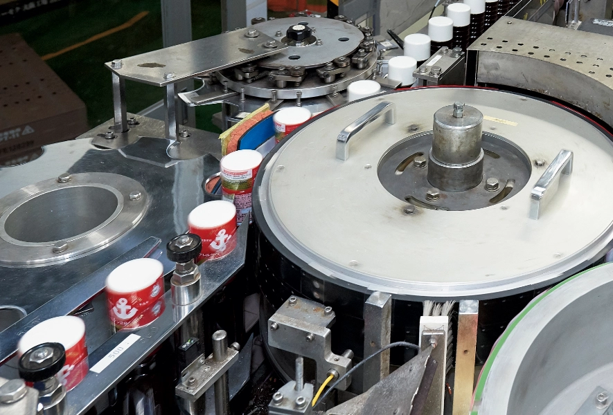 続いて賞味期限が印字されたラベルを貼りつけ、ラベルチェック機と人の目で検品を行います。